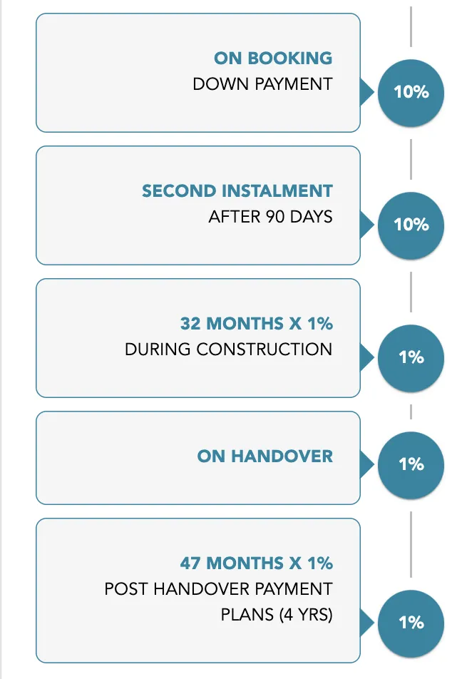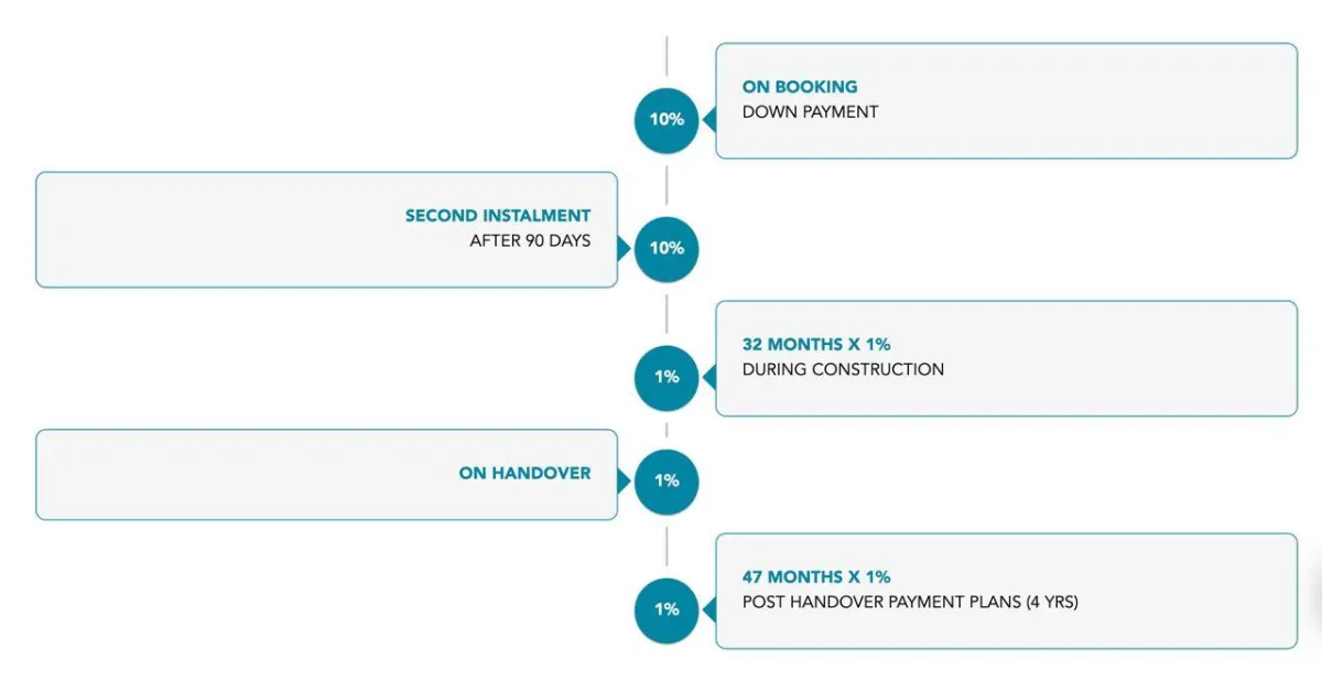 Rent-to-own with 20/80 plan: 10% down, 10% in 3 months, 1% monthly for 32 months, then 1% on hand-over followed by 1% for 47 months. This plan is designed to align with rental yields for equity build-up and is projected to provide a 12% Return on Investment (ROI) in a prime location